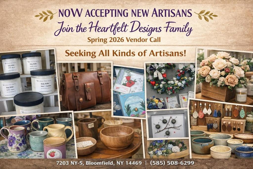 Heartfelt Designs is located in Bloomfield NY with 100 local artisans and a wide variety of gifts, antiques, art, home decor, sweet treats, coffee, jam & more!